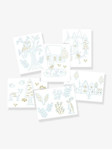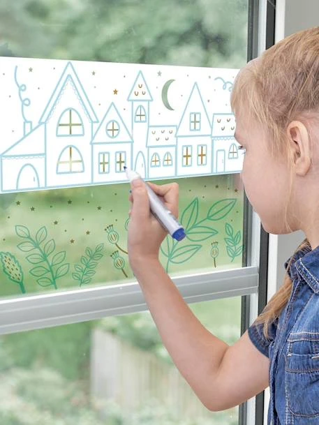Dans ce nouveau coffret, les enfants découvrent deux super feutres pour vitre: un doré et un bleu clair. Ils y retrouveront aussi 6 modèles et 2 frises à coller à l’arrière de la fenêtre et à décalquer, magnifiquement illustrés par Mel Armstrong.