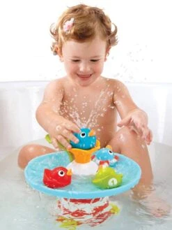 La course aux canards de Yookiddo est un jeu de bain qui amusera les enfants ! La course démarre lorsque l’enfant appuie sur la feuille. Les canards tournicotent et peuvent se placer au dessus de la fleur pour créer un jet d’eau différent selon le canard.
