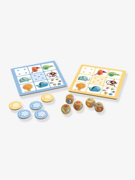 - Contient : 5 dés identiques en bois, 4 cartes et 24 jetons en carton